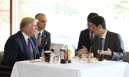 Ngoài chiếc bánh hamburger, Thủ tướng Abe còn mời Tổng thống Trump và phu nhân Melania tới ăn tối tại nhà hàng Ukai Tei, khu Ginza và thết đãi món bít tết bò Mỹ thượng hạng và sò điệp nướng.
