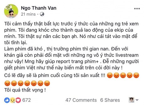 Nữ diễn viên kiêm nhà sản xuất Ngô Thanh Vân bức xúc viết lên trang cá nhân của mình