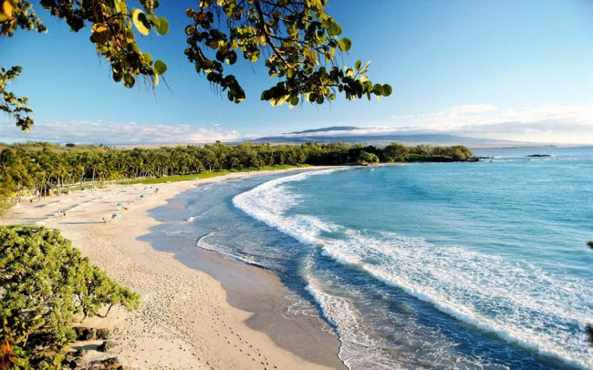 Bãi biển cát trắng trên đảo Big ở Hawaii có hình lưỡi liềm và được bao quanh bởi hàng cọ xanh mát. Khách sạn Mauna Kea Beach được xây dựng ngay sát bãi biển tạo thuận tiện tối đa cho du khách.
