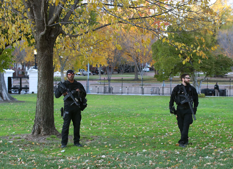 Các nhân viên của Cơ quan Mật vụ Mỹ đứng canh giữ tại bãi cỏ phía bắc Nhà Trắng để đảm bảo an ninh khi đệ nhất phu nhân và con trai nhận cây. Ảnh: Getty.