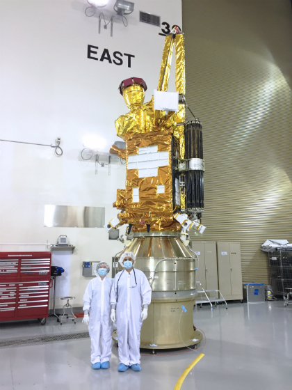 Liên Phạm (trái) và đồng nghiệp đứng cạnh tàu vũ trụ SMAP được lắp ráp đầy đủ sau khi thêm chăn nhiệt.