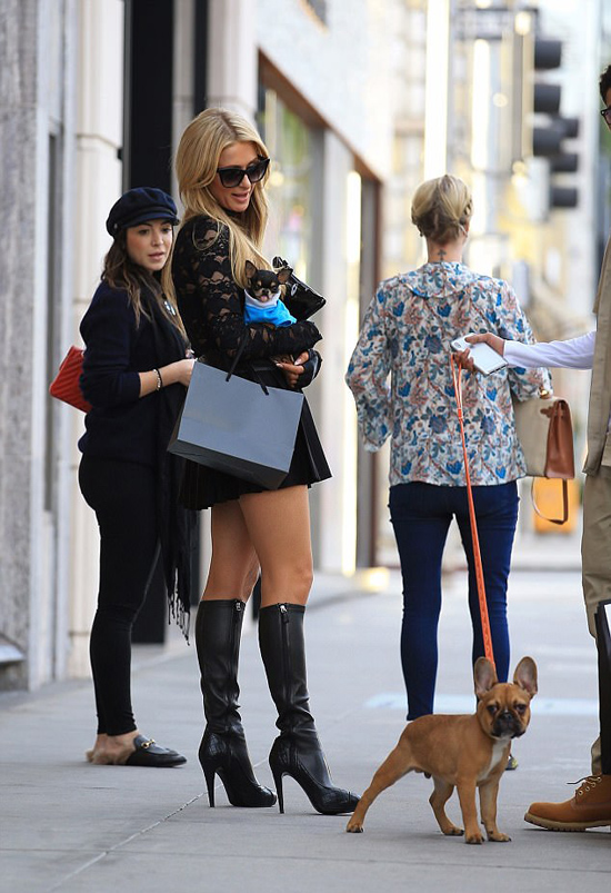 Paris Hilton và cô em gái Nicky Hilton cùng nhau đi mua sắm quanh Beverly Hills hôm 21/11. Paris bế theo một trong những chú cún cưng của cô, con chihuahua bé bỏng mang tên Diamond Baby.