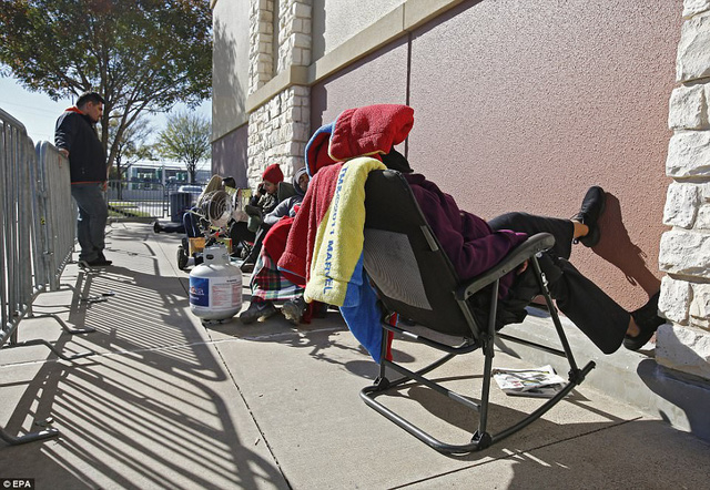 Dưới đây là loạt ảnh những tín đồ mua sắm ở bang Texas, Mỹ đã mang chăn, ghế, đèn sưởi, thậm chí bàn uống trà đến các vỉa hè trên các con phố mua sắm, sẵn sàng xếp hàng qua đêm chờ tới lượt được mua các món hàng với giá siêu rẻ trong ngày bán hàng giảm giá lớn nhất nước Mỹ được gọi là Black Friday (Thứ 6 đen tối).