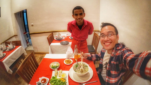 "Mình ấn tượng với quán phở ở Hungary nhất. Quán khá xa trung tâm thành phố, mình di chuyển mấy chặng tàu điện mới tới. Cô chủ lâu lắm mới thấy người Việt Nam nên nhiệt tình, chuẩn bị một bát phở to đầy và rất ngon. Còn vài quán khá tệ, có lẽ do đầu bếp hoặc chủ không phải người Việt. Nhiều quán chế biến lạ, cho phở khô vào", chàng trai 28 tuổi đi qua 45 nước và vùng lãnh thổ kể lại.