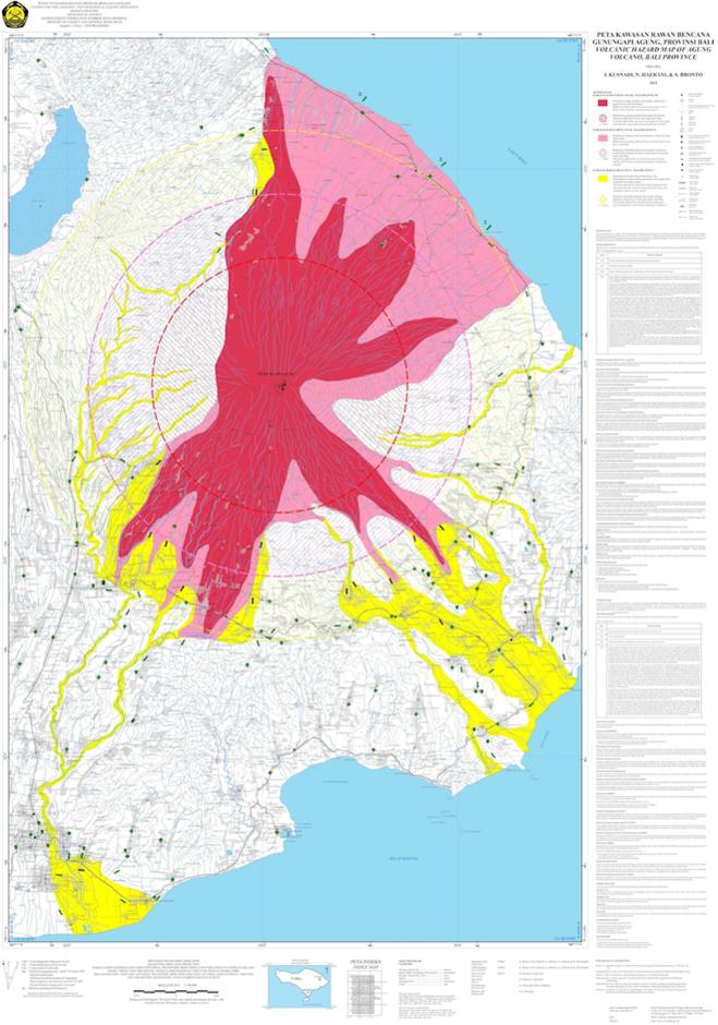 Sự bất ổn hiện tại của Agung đang được CVGHM giám sát chặt chẽ nhằm đưa ra cảnh báo sớm nhất đến người dân và chính quyền đảo. Trung tâm này đã đưa bản đồ dự đoán những khu vực sẽ bị ảnh hưởng: