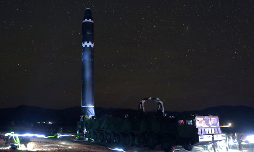 Tên lửa Hwasong-15 trước khi khai hỏa. Ảnh: Reuters.