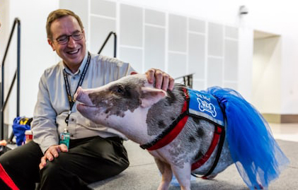 Nàng heo LiLou là thành viên mới nhất trong “Lữ Đoàn Ngoắc Đuôi” (Wag Brigade), một lực lượng thú nuôi tinh nhuệ được huấn luyện nhằm giúp những hành khách máy bay bẳn gắt khó chịu được lên tinh thần.