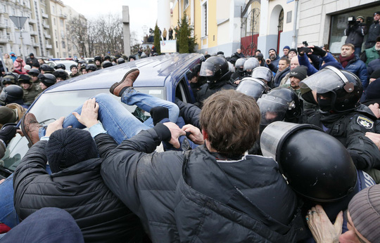 Người ủng hộ ông Saakashvili đụng độ với cảnh sát để ngăn chiếc xe chở ông này đi khỏi. Ảnh: Reuters
