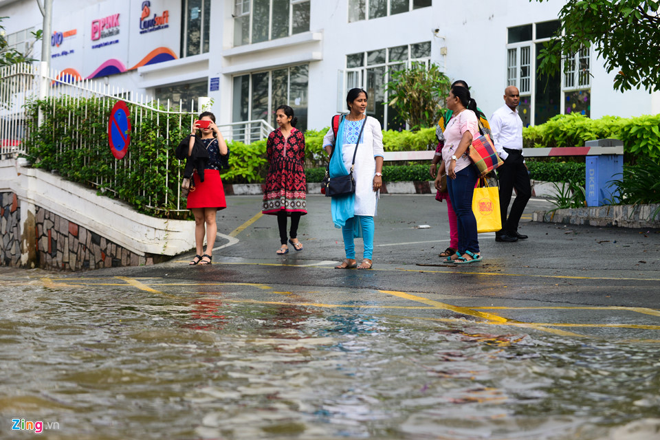 Nhiều người nước ngoài làm việc tại khu Thảo Điền, quận 2, không thể di chuyển giữa dòng nước ngập, đợi xe đến đón.