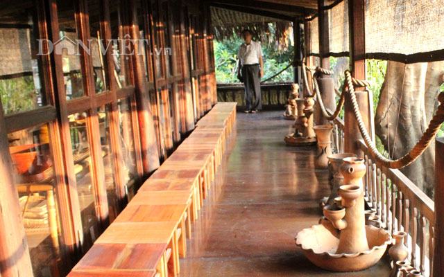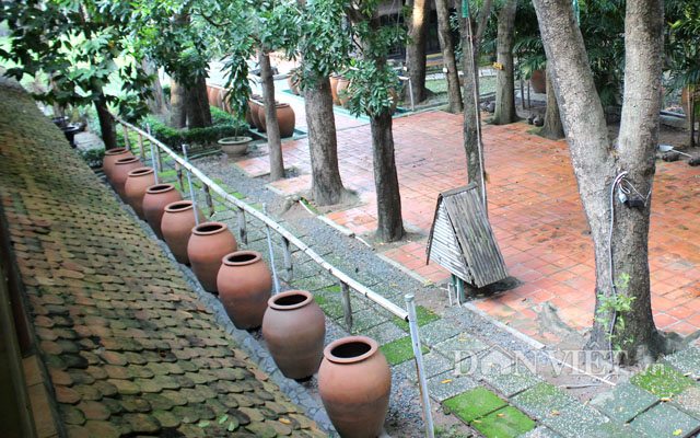 Ở gian nhà đậm màu sắc Nam Bộ, người xem dễ dàng những vật dụng quen thuộc như lu nước, ống tre, gáo nước...