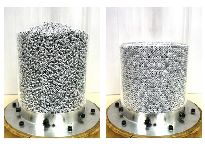 Trong lúc tìm một cách hiệu quả để "đặc hóa" những vật chất có dạng viên, nhà nghiên cứu Diego Maza và các đồng nghiệp của mình tại Đại học Navarra, Tây Ban Nha đã sử dụng những viên xúc xắc bằng nhựa, cho vào một lồng trong suốt có hình trụ, cho nó xoay theo cả hai chiều. Họ thấy rằng việc xoay có những hiệu ứng khác với việc gõ lên ống.