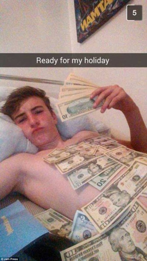 Một cậu ấm trong hội con nhà giàu khoe đang nằm trên một đống tiền.