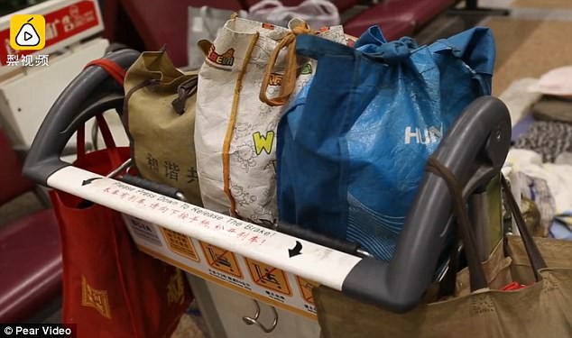 Tất cả đồ đạc của ông Wei được chất đầy cái xe đẩy đi khắp sân bay.