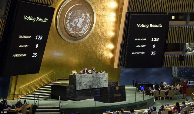 Reuters dẫn kết quả bỏ phiếu tại Đại hội đồng Liên Hợp Quốc cho biết, tổng cộng 128 thành viên đã bỏ phiếu thuận, 9 thành viên bỏ phiếu chống và 35 thành viên bỏ phiếu trắng trong khi 21 thành viên không bỏ phiếu.