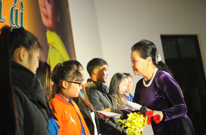 Cũng nhân dịp này, ca sĩ Khánh Ly đã trao tặng 10 phần quà cho 10 sinh viên nghèo vượt khó của trường.
