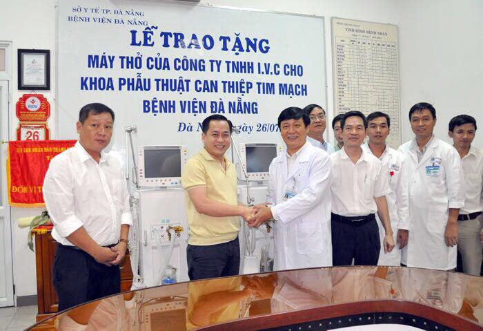 Ông Vũ "nhôm" (áo vàng) tặng máy thở cho bệnh viện Đà Nẵng.