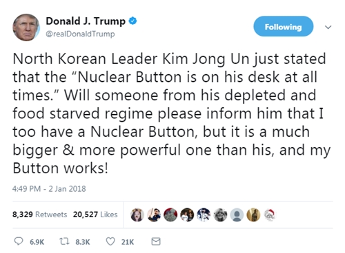 Tổng thống Mỹ Donald Trump ngày 2/1 đăng bài trên Twitter cá nhân, khoe ông "có nút kích hoạt hạt nhân to hơn và uy lực hơn của nhà lãnh đạo Triều Tiên Kim Jong-un". Động thái này nhanh chóng vấp phải sự chỉ trích từ các cựu quan chức Mỹ và giới chuyên gia, Guardian đưa tin.