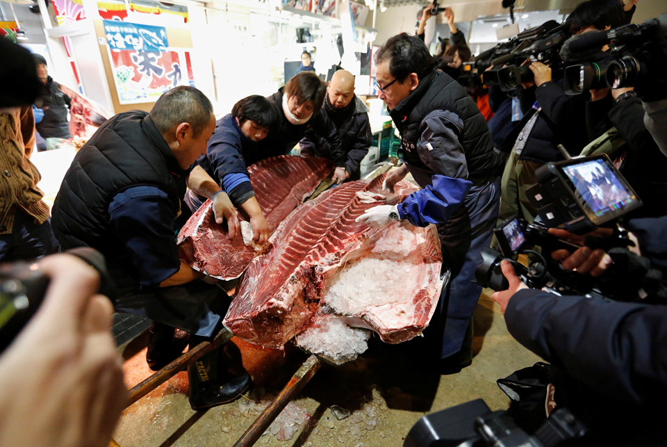 Con cá ngừ 405 kg được mổ thịt sau buổi đấu giá. Tháng 12 vừa qua, chính quyền Tokyo đã quyết định đóng cửa chợ Tsukiji và chuyển các hoạt động tại đây sang một cơ sở mới có tên Toyosu với đầy đủ các điều kiện về cơ sở vật chất, an toàn và vệ sinh, với kế hoạch dự kiến hoàn tất vào tháng 10. Việc di dời được triển khai sau 1 năm đình trệ bởi vấp phải sự phản đối của các thương nhân hoạt động lâu năm tại chợ Tsukiji. Ảnh: Reuters.