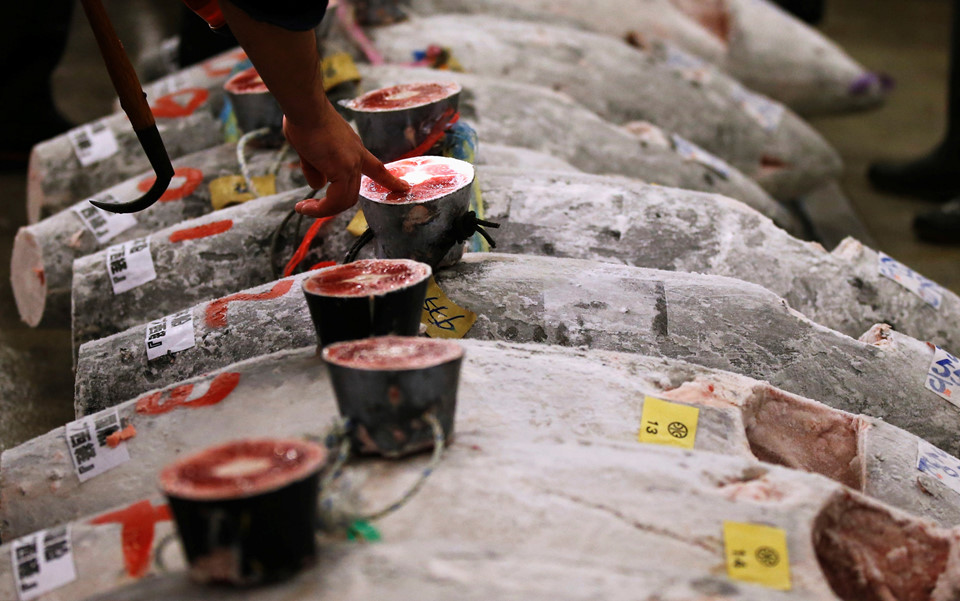 Người mua kiểm tra chất lượng cá ngừ. Chợ cá Tsukiji được lập ra từ năm 1935 với cơ sở hạ tầng hiện đại bậc nhất thế giới vào thời gian đó. Chợ là nơi cung cấp khoảng 480 loại hải sản, từ rong biển rẻ tiền đến trứng cá muối đắt tiền hay thậm chí cả thịt cá voi. Mỗi năm, chợ Tsukiji bán ra khoảng 700.000 tấn hải sản, thu về khoảng 6 tỷ USD. Ảnh: Japan Times