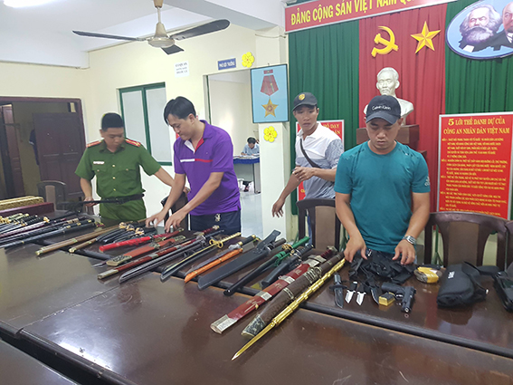Công an đã thu giữ nhiều tang vật như: roi điện, súng bắn đạn bi và khoảng 50 cây đao, kiếm... Tổng kho hàng này có giá trị hơn 50 triệu đồng.