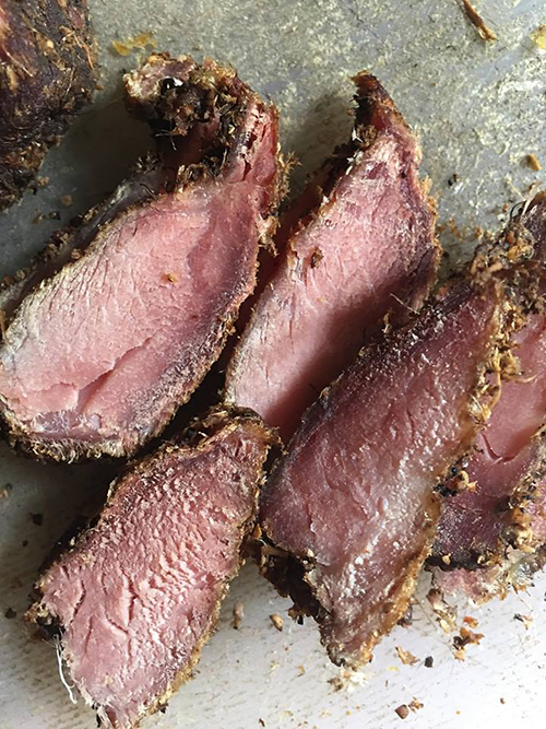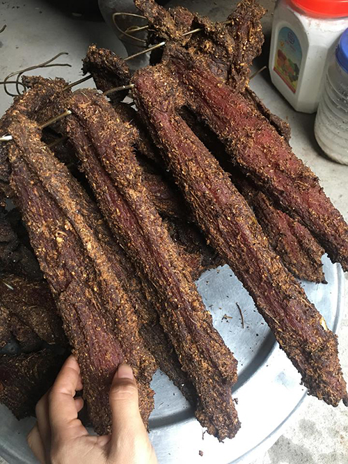 Thịt gác bếp thành phẩm nhìn ngoài màu nâu sẫm, khi xé ra bên trong màu đỏ tự nhiên đặc trưng. Khi ăn bạn có thể đập dập xé nhỏ, chấm cùng với chẳm chéo hoặc tương ớt đều ngon.
