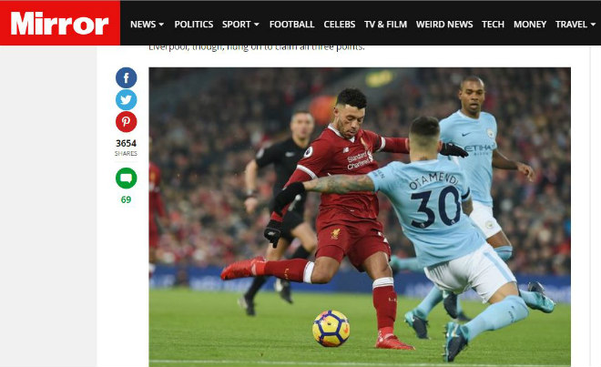 Trong khi ấy, một tờ báo thể thao nổi tiếng khác của nước Anh là tờ Mirror thì giật tít: “Liverpool 4-3 Man City: Lữ đoàn đỏ cuồng bạo chấm dứt mạch 22 trận bất bại của thầy trò Pep Guardiola”, trong đó nhấn mạnh chi tiết Liverpool vẫn rất đáng sợ dù không còn Philippe Coutinho trong đội hình.