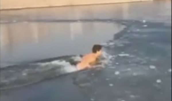 Những người trên bờ khi đó hoảng hốt kêu lên, "bơi quá rồi, bơi quá rồi". Người đàn ông mất vài giây loay hoay dưới mặt băng vì không thể nổi lên.