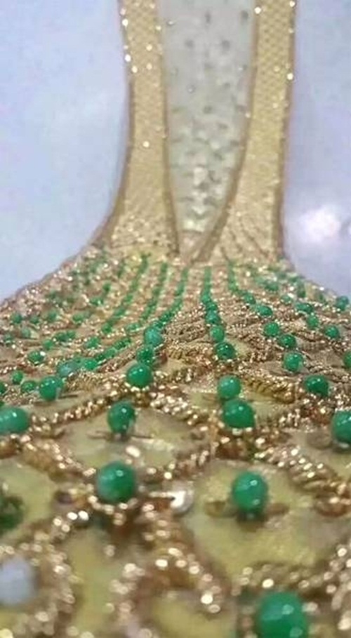 Váy cưới của cô dâu và chiếc khăn choàng truyền thống, tất cả đều được làm thủ công. Vải dệt bằng chỉ vàng, thêu cũng bằng chỉ vàng. Những viên ngọc tuyệt đẹp cũng được gắn lên theo phương thức thủ công, từng viên một.