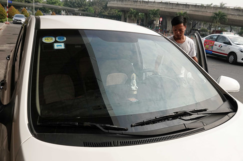 Trên xe của anh Hùng cũng như nhiều tài xế Grab, Uber khác, chỉ có phù hiệu của hãng nhưng hai bên cửa kính lại thiếu phù hiệu của HTX vận tải. Dù lỗi này tài xế không phải là người bị lập biên bản nhưng cũng khiến tài xế "mệt mỏi" vì không biết thương lượng với HTX thế nào...