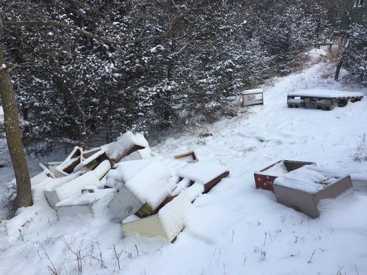 Justin là chủ trại ong và phát hiện ra vụ phá hoại hôm 28.12.2017 khi họ đi cào tuyết. “Chúng lẻn vào nhà kho, lấy toàn bộ thiết bị ra ngoài và đập nát. Chúng không lấy cắp thứ gì mà chỉ cố tình phá hoại tài sản của tôi”.