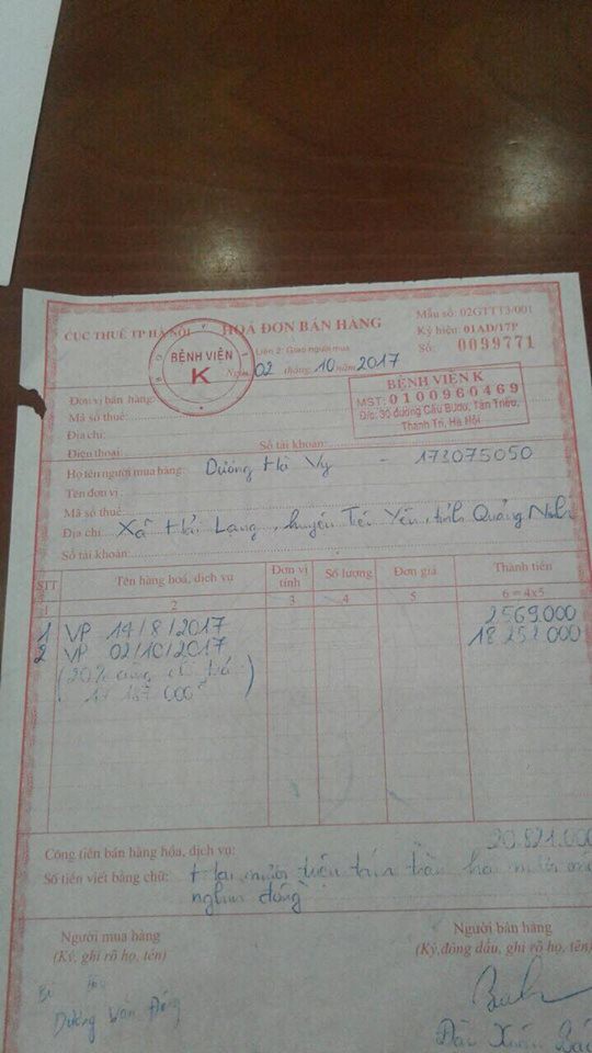 Hóa đơn khám chữa bệnh của cháu Vy.