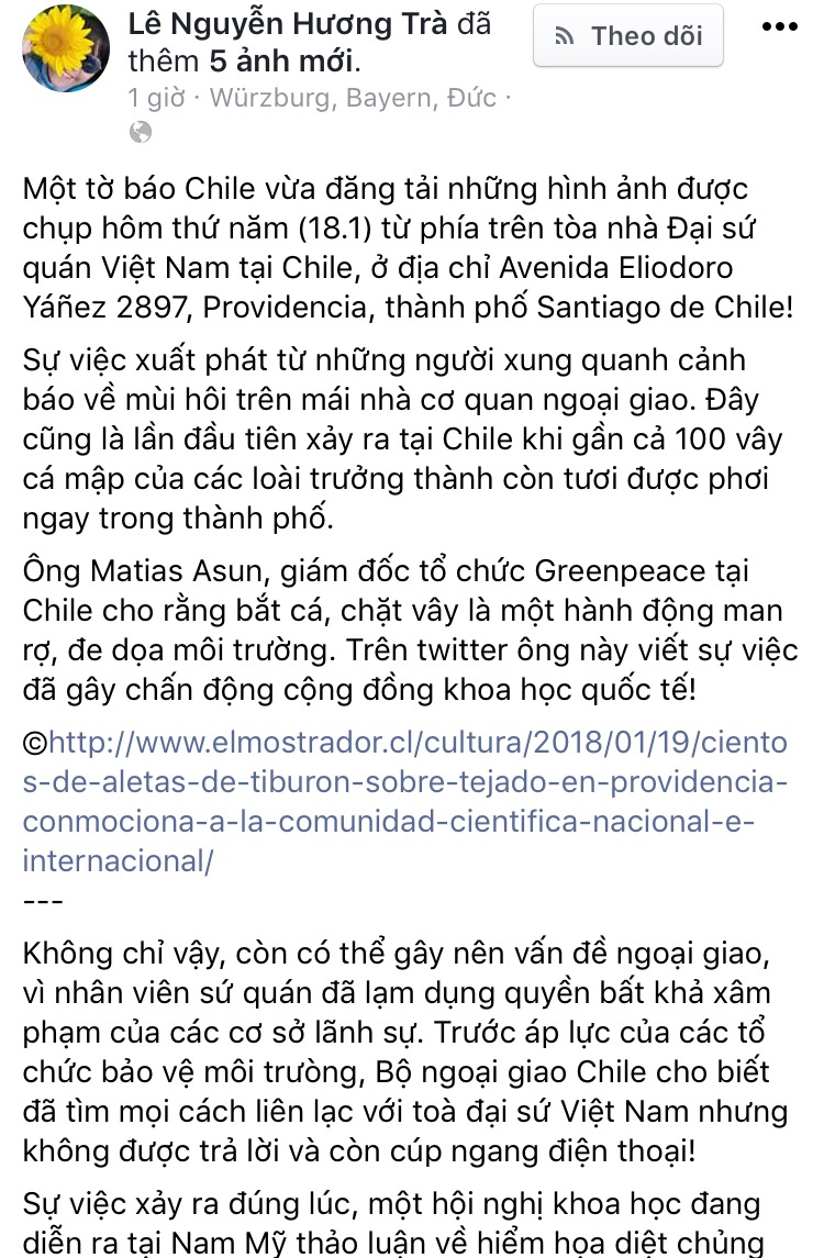 VBF-Sứ quán VN lại làm trò không thể chịu nổi. Phơi cả 100 vây cá mập trên nóc nhà tại Chile. Theo đó hàng xóm phàn nàn vì mùi hôi bốc ra từ nơi đây. Ngoài ra đúng lúc tại Chile đang có một hội nghị khoa học về hiểm họa diệt chủng của cá mập. Hết nói nổi!