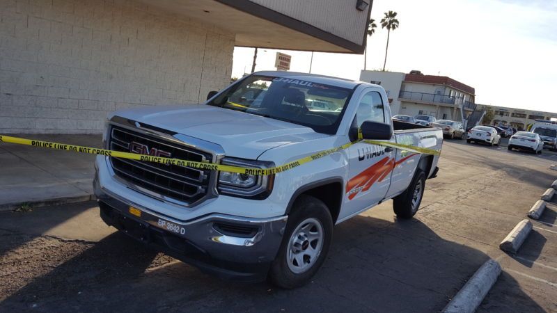 Chiếc xe của hãng Uhaul được hai nghi can sử dụng để chạy trốn cảnh sát. (Hình: Đằng Giao/Người Việt)