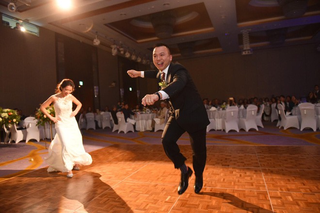 Cô dâu chú rể bước vào khán phòng bằng cách trình làng điệu nhảy Gangnam style cực sung, khiến bầu không khí trở nên sôi động.