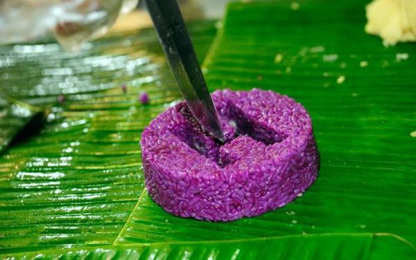 Dàn đều phần gạo nếp xào lá dứa lên lá chuối để bọc kín phần nếp cẩm in chữ