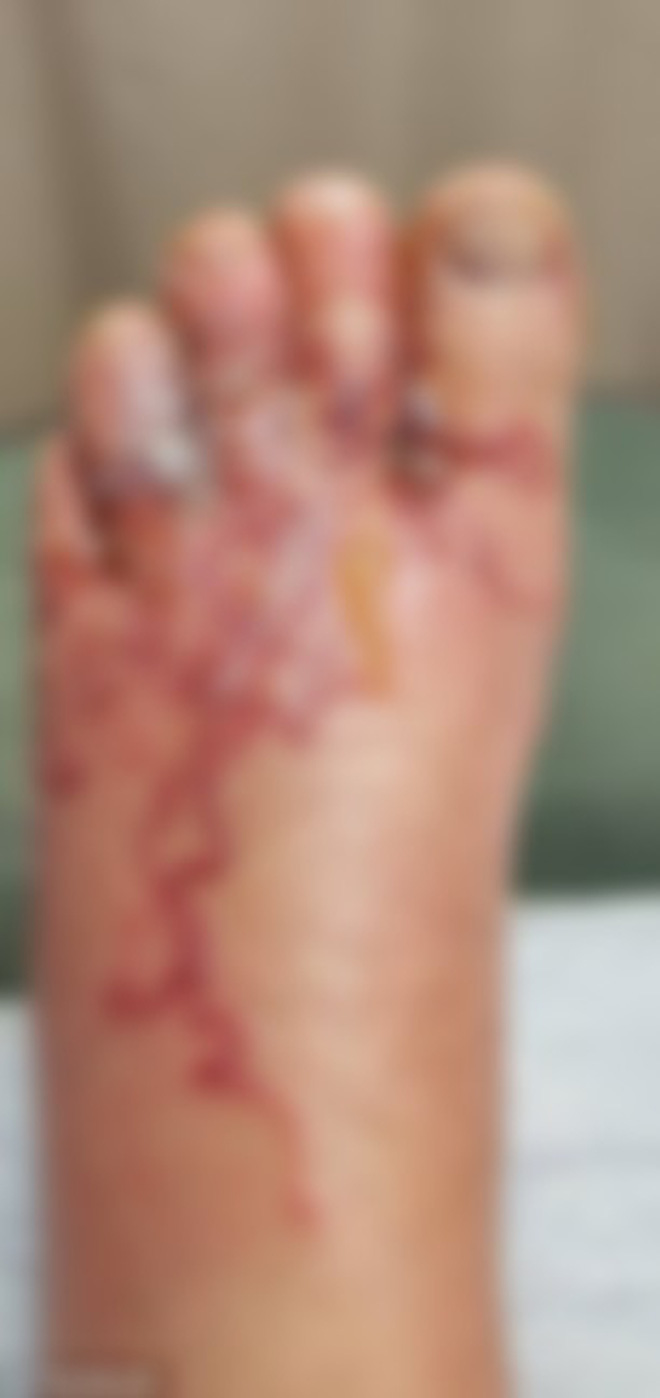 Một cặp vợ chồng đã vô cùng hoảng sợ sau khi bàn chân bỗng sưng phồng, đau rát. Họ đã không đi dép khi đi dạo ngoài biển. Sau khi về phòng, chân bắt đầu ngứa không thể kiểm soát và sưng rộp lên.