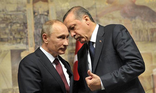 Tổng thống Nga Putin (trái) tṛ chuyện cùng ông Erdogan. Ảnh: Moscow Times.