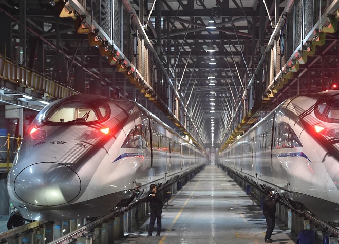 Các nhân viên Trung Quốc kiểm tra lại đoàn tàu cao tốc trước khi đón 400 triệu lượt khách trong dịp Tết Nguyên đán năm nay.
