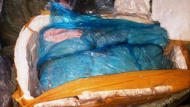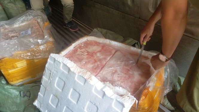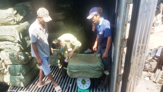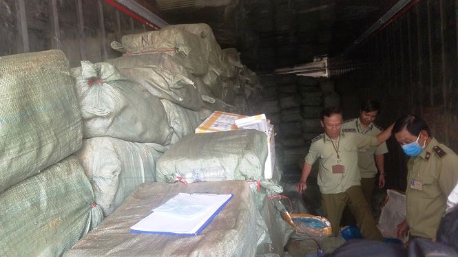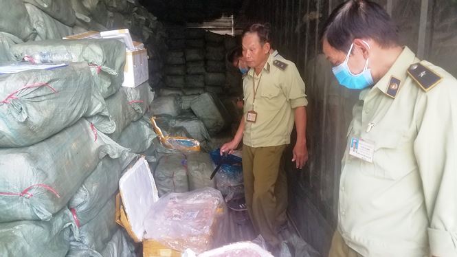 Qua kiểm tra ban đầu, cơ quan chức năng xác định trong container có 310 thùng xốp, mỗi thùng khoảng 50kg nậm heo đã bốc mùi hôi thối, rỉ dịch vàng.