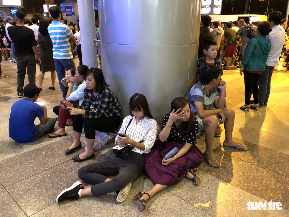Hành khách ga nội địa ngồi thâu đêm chờ lên chuyến bay sớm - Ảnh: QUANG THẾ