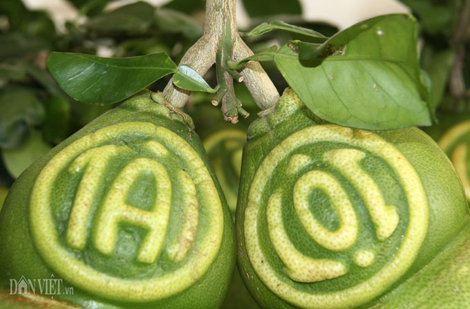 Đặc biệt, trong số lượng bưởi tạo hình trên, có 2 cặp bưởi vô cùng đặc biệt, được bán với giá 2,5 triệu mỗi cặp. Đây là loại bưởi cặp, có trên cùng một nhánh và được ông Thành lựa chọn thật cẩn thận để tạo hình hô lô, ép chữ. Ông Thành gọi loại bưởi này là bưởi hồ lô Tài Lộc Đồng Sinh.