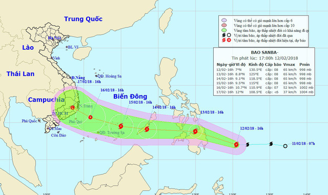 Áp thấp nhiệt đới đã mạnh lên thành bão Sanba sắp đi vào Biển Đông. Trung tâm Dự báo khí tượng thủy văn Trung ương dự báo, đến 16h ngày 15/2, vị trí tâm bão Sanba ở vào khoảng 9,5 độ Vĩ Bắc; 115,0 độ Kinh Đông, cách đảo Trường Sa (thuộc quần đảo Trường Sa) khoảng 340km về phía Đông Đông Bắc. Sức gió mạnh nhất ở vùng gần tâm bão mạnh cấp 8 (60-75km/giờ), giật cấp 11.