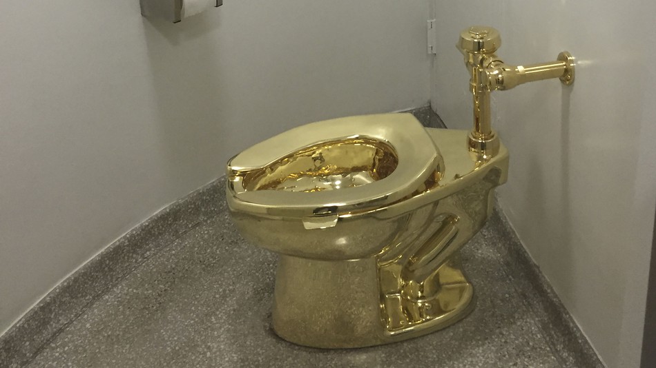 Bồn vệ sinh bằng vàng 18 karat, có nhan đề là America (Hoa Kỳ), là tác phẩm của ông Maurizio Cattelan được tạo ra nhằm phê phán bản năng tham lam của nước Mỹ.