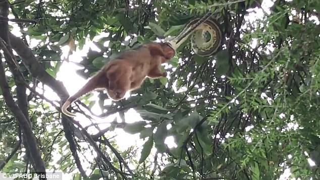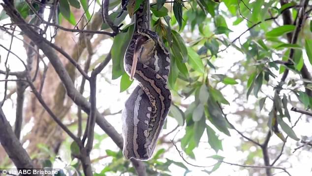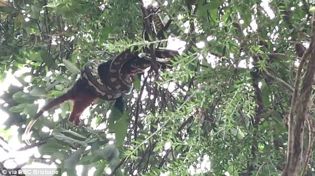 Video con trăn nuốt thú có túi treo lơ lửng trên cây.