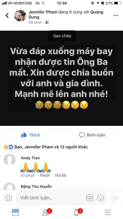 Cô viết trên trang cá nhân rằng, "Vừa đáp xuống máy bay nhận được tin ông Ba mất. Xin được chia buồn với anh và gia đình. Mạnh mẽ lên anh nhé!".