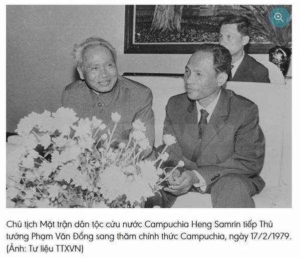 Bức hình Phạm Văn Đồng và chụp với chủ tịch CS Campuchia Heng Samrin ngày 17 tháng 2, 1979 tại Nam Vang trong dịp Thủ tướng CS Phạm Văn Đồng và Tổng Tham Mưu Trưởng Quân Đội CS Văn Tiến Dũng cùng phái đoàn đông đảo viên chức và tướng lãnh CS thăm Campuchia.