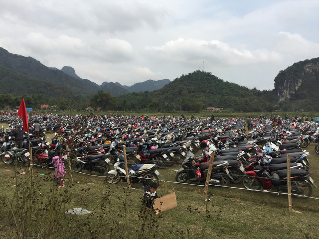 Bãi xe máy kín chỗ, nhiều người sợ không có chỗ gửi xe đã chấp nhận đi dịch vụ xe điện từ ngoài cầu treo vào suối cá.