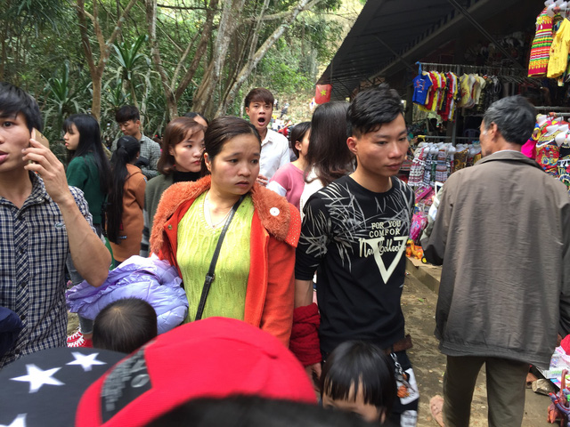 Một du khách đang sốt ruột chờ được qua cầu treo để vào suối cá cho biết, anh về quê Nghệ An ăn tết, trên đường trở ra Hà Nội tranh thủ rẽ vào cho các con được xem suối cá đặc biệt này. Anh không ngờ lượng người đổ về suối cá đông như vậy, khiến các con phải chờ đợi mệt mỏi trong thời tiết nắng nóng.