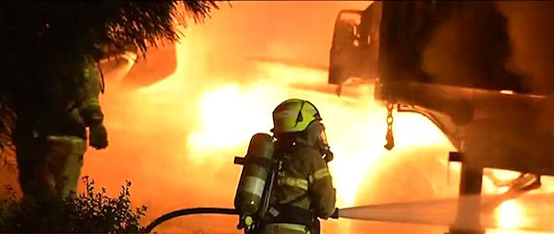Chiếc xe vận tải đã chở một thùng container rỗng. Khi xe bị tông rào cản thì sự va chạm quá mạnh đã làm nứt bình, và xăng chảy xuống đường.