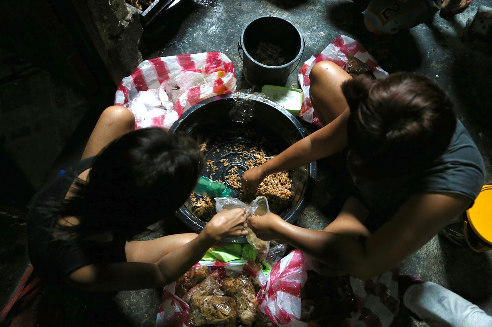 "Đây này, đây là thịt này", cô nói. "Giờ việc của chúng tôi là rửa sạch chúng, cho vào túi nilon và bán nó vào sáng sớm. Dễ bán lắm vì nó rẻ mà, hàng xóm tôi ai cũng muốn đồ ăn rẻ. Chỉ tầm 20 peso - tương đương với 11 nghìn, một túi".